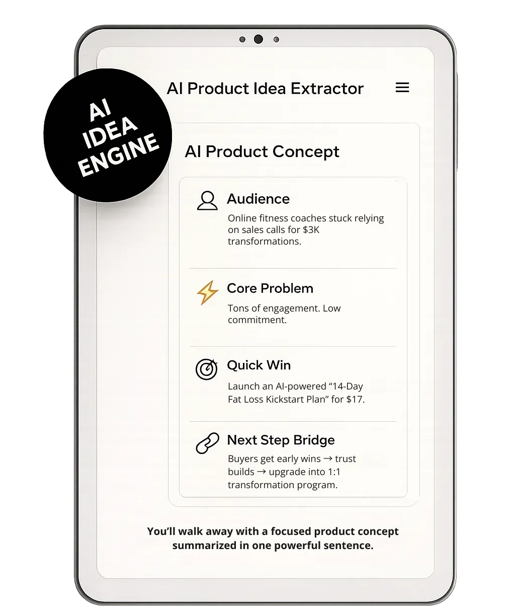 You’ll walk away with a focused product concept summarized in one powerful sentence.